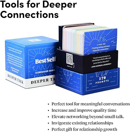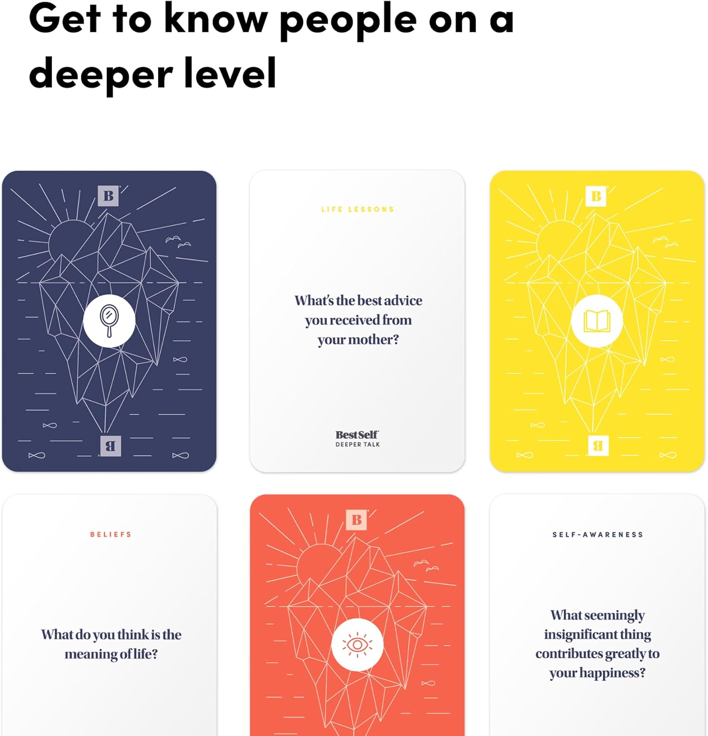 POWERFUL TOOL FOR IMPROVING QUALITY TIME AND COMMUNICATION WITH OTHERS — Created to take your conversations to the next level from our Icebreaker Deck, the Deeper Talk Deck has six categories (Courage, Beliefs, Life Lessons, Self-Awareness, Dreams and Exposed) that are designed to uplevel your conversations, strengthen your connections and empower you to know the people in your life in a more meaningful way.