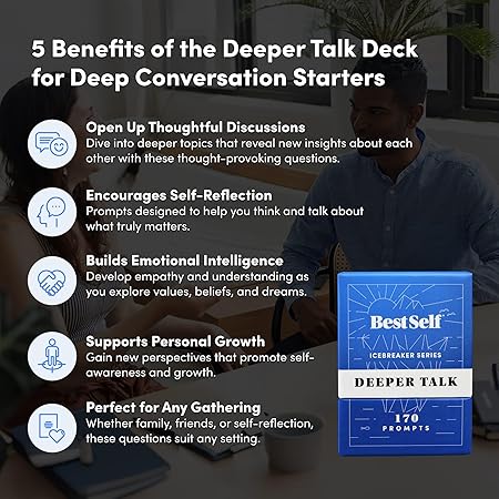 CONVERSATION STARTER TO CREATE LASTING AND MORE IMPACTFUL RELATIONSHIPS — The Deeper Talk Deck has 170 thought-provoking question cards to improve interactions with loved ones, friends and colleagues alike with stimulating and relationship-building conversations that breakdown communication barriers to cultivate connections, openness and vulnerability.