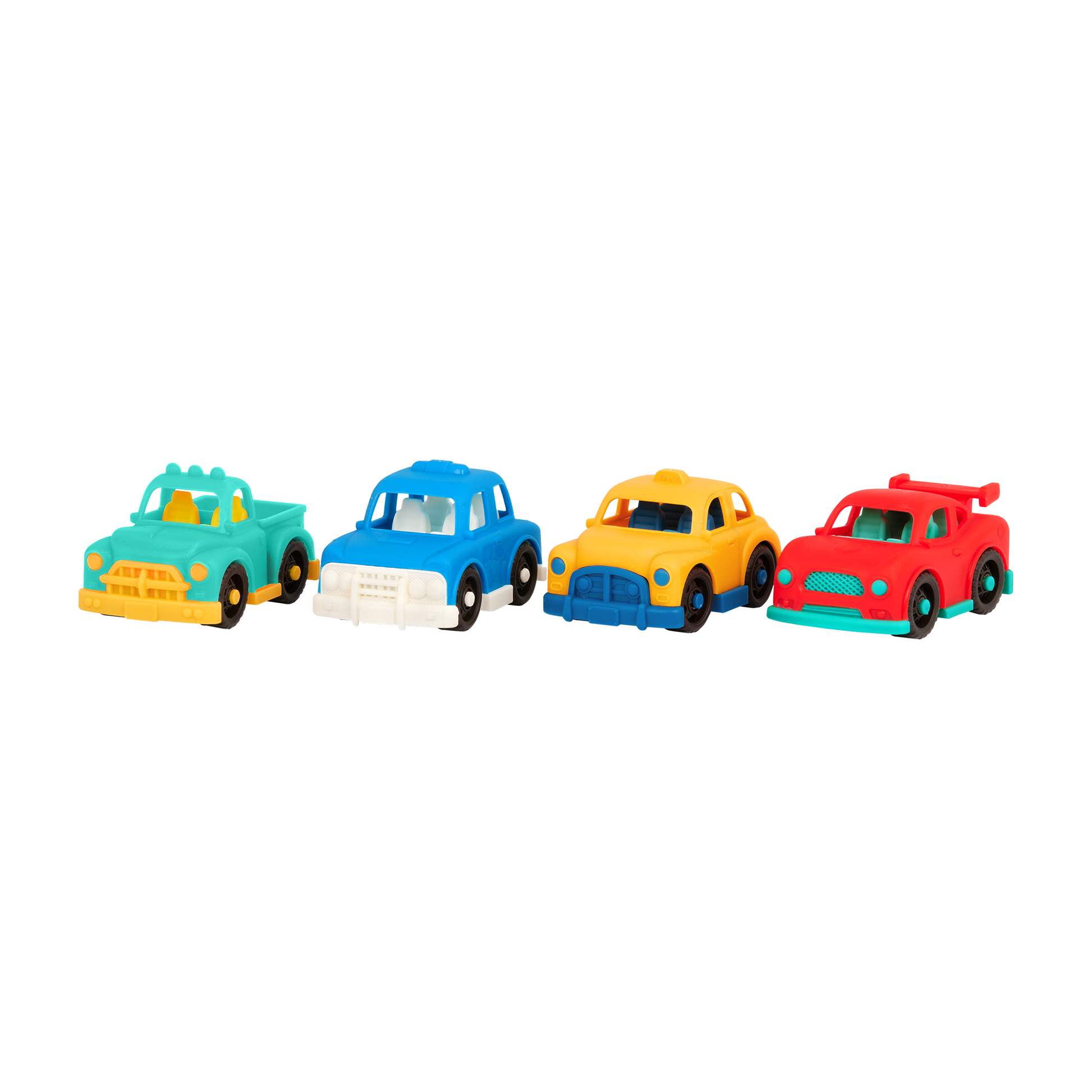 Vroomin’ Variety: Set of 4 includes a yellow taxi, a teal pick-up truck, a blue police car, and a red sports car!