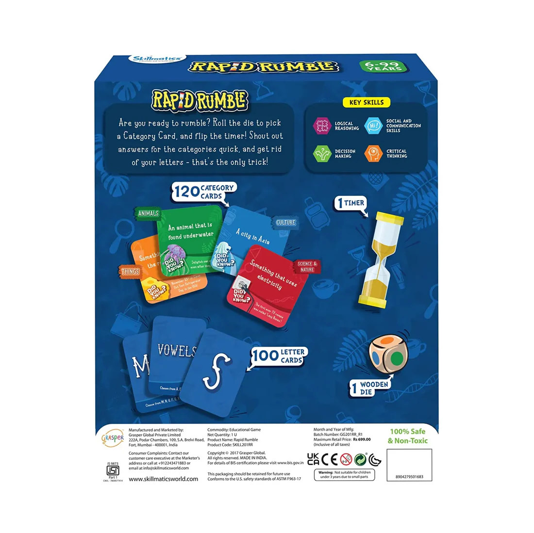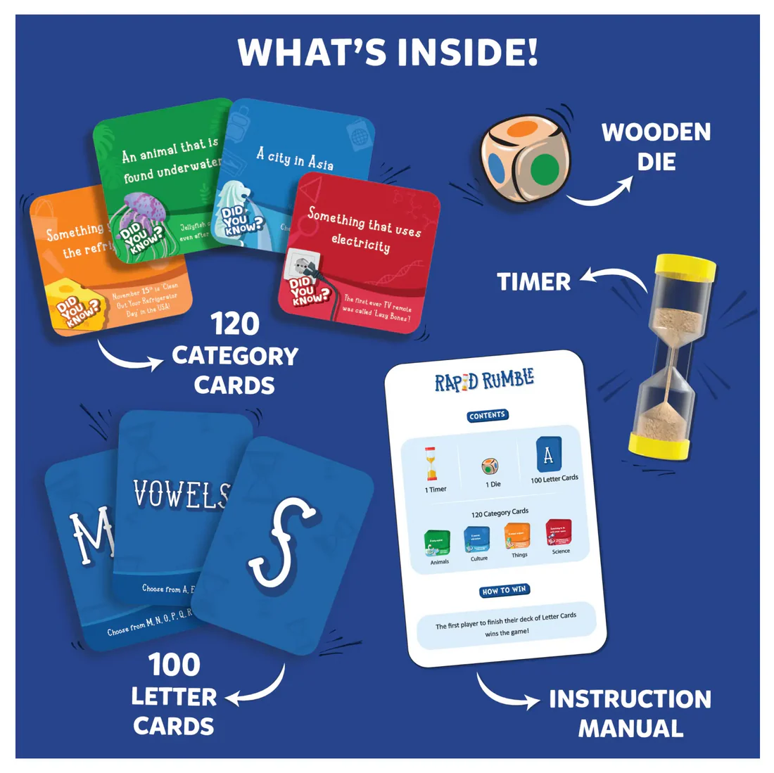 Rapid Rumble is the fastest, funniest and cleverest category game! Roll the die, set the timer, and get ready to rumble! Discover Animals, Things, Culture, Science and Nature as you play this exciting game.
